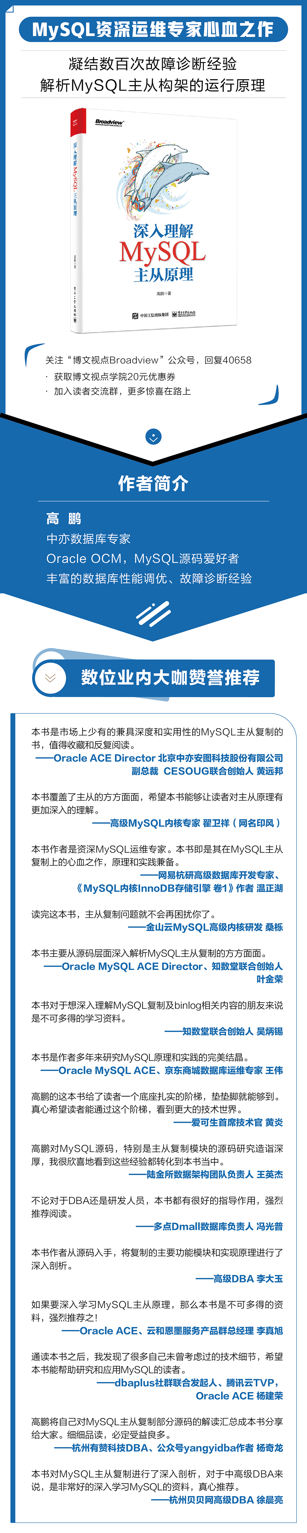 在超大规模流量的分布式系统环境下,无论是从系统性能的角度,还是从数据安全性的角度,掌握 MySQL 主从原理,都是当下技术人员的必备基本功。MySQL 主从原理是高可用架构的基石,即便是MGR这种集群架构也可以看到主从的影子。要解决一个问题或者故障,最快的方式就是了解它的原理,快速定位问题。《深入理解 MySQL 主从原理》从源码层面抽丝剥茧般地描述 MySQL 主从原理,全面地介绍了GTID相关的知识点,并解析了主要 Event 的生成、作用和格式,以及线程的初步知识、MDL LOCK、排序等热门话题和主从相关的案例。