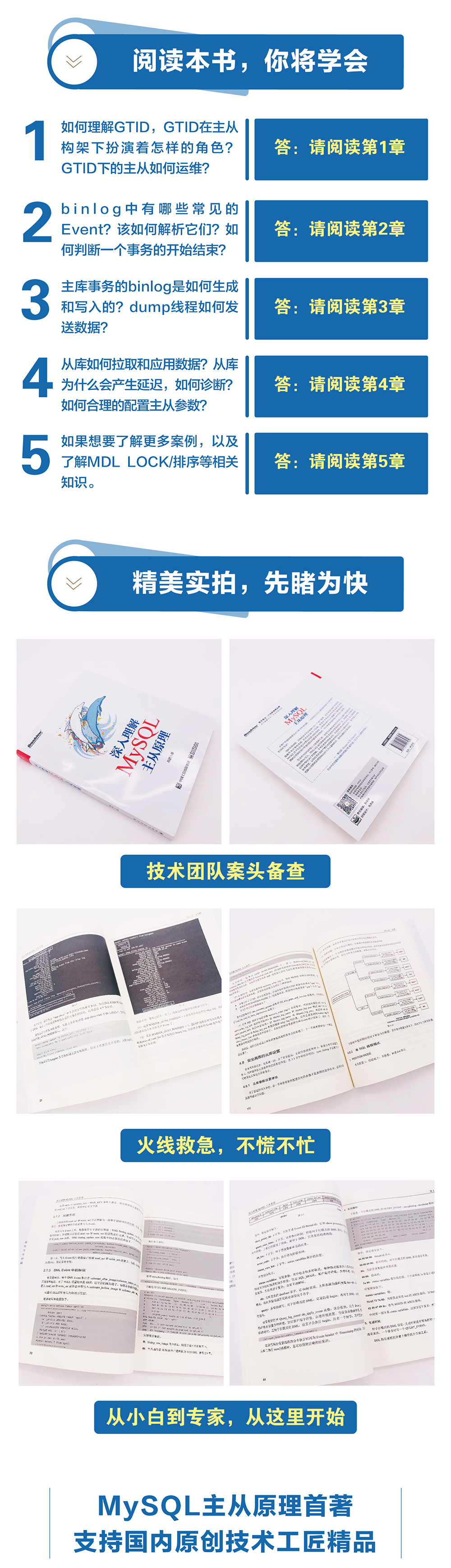 深入学习主从原理,需要按照一定的顺序学习,如果不知道 GTID、不知道 Event、不知道主库如何生成 Event,那么肯定不能深入理解主从原理,因此本书按照这种顺序进行讲解。本书一共分为5章,前4章应该作为一个整体顺序阅读,第5章和前面4章没有关联,可以独立阅读。