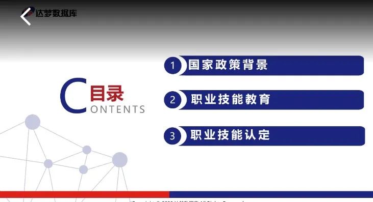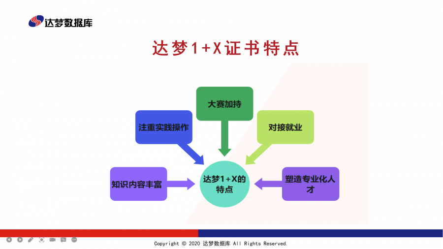 达梦高级副总经理王婷从学生“就业难”、企业“招聘难”问题切入,从学生和院校的立场上,分享了个人对1+X评价组织(即承担1+X培训的企业)的选择标准,她认为评价组织应具备雄厚的产业背景,扎实的人才培养经验,并要与高校课程相融合,以此为对照标准,她对达梦的相关情况进行了介绍。
