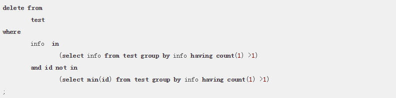 以假设业务要求要保留如下test表中每组info重复值中id最小的row为例