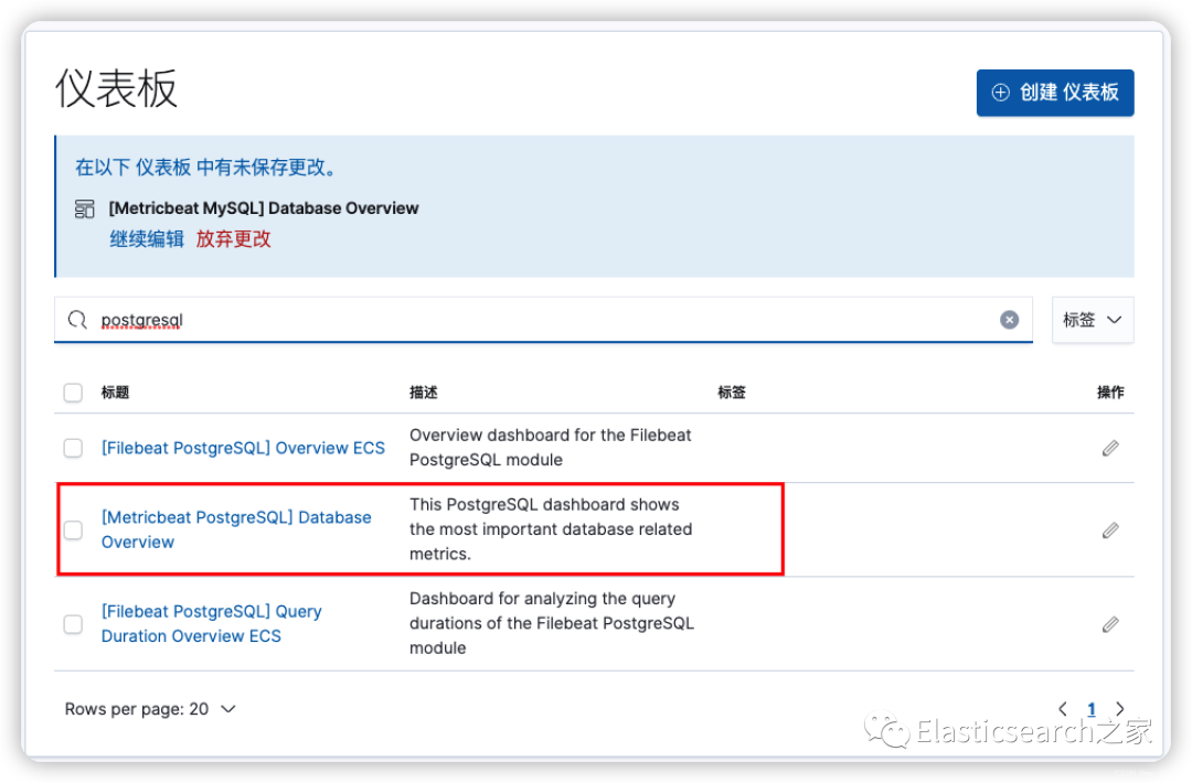 9、kibana中点击Dashboard,进入仪表盘,输入postgresql