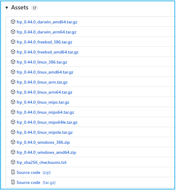 把下载下来的文件解压后,里面有两套文件,一套是 frpc 及相关的配置文件,另一套是 frps ,分别是客户端和服务端。
