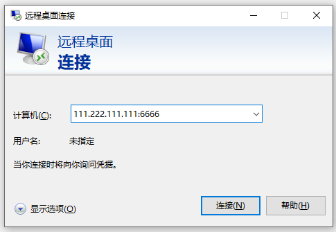 在 frpc.ini 中需要填写服务端的公网IP,这里使用的是 fake IP,其中 local_port 和 remote_port 分别是本地的端口,以及映射后的端口。最终远程桌面访问时在公网IP后面加上端口,比如: