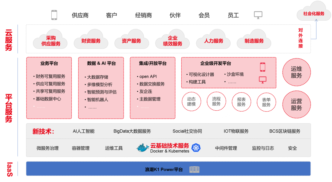 平台服务层:平台服务层融合Kubernetes和Docker,践行DevOps理念,帮助企业统一IT系统的基础运行环境。 云服务:NC Cloud围绕人、财、物、客等四大管控对象,构建企业管理和运营平台,同时提供第三方系统的对接能力。