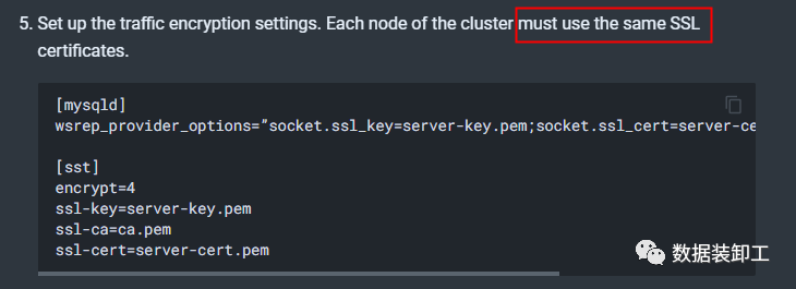 所以,需要把第一个使用mysql@bootstrap.service启动节点下的*.pem文件复制给其余节点,第一次启动时mysql服务会生成密钥文件在对应的data目录下,如果/etc/my.cnf为默认参数,文件在/var/lib/mysql下。