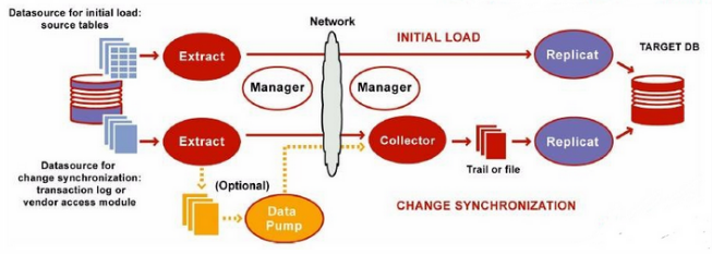 源端通过抽取进程提取redolog或archivelog日志内容,通过pump进程(TCP/IP协议)发送到目标端,最后目标端的rep进程接收日志、解析并应用到目标端,进而完成数据同步。