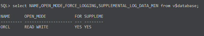 selectNAME,OPEN_MODE,FORCE_LOGGING,SUPPLEMENTAL_LOG_DATA_MINfromv$database;