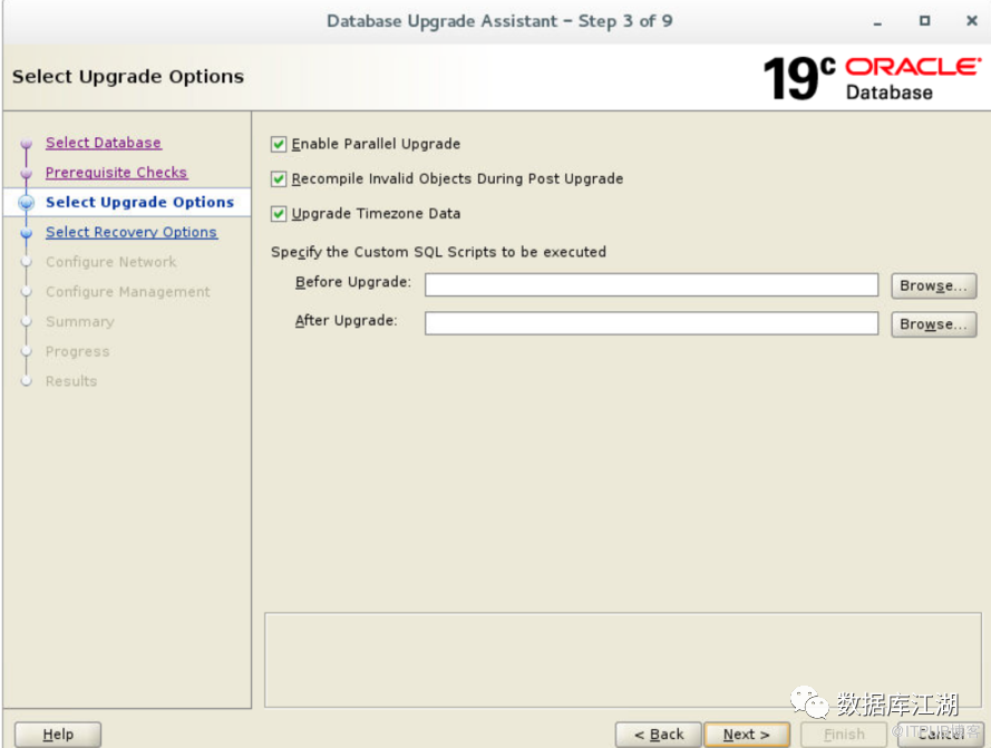 一旦 pre-upgrade 警告被解决,下一个屏幕会显示各种选项,比如启用并行升级,在升级后的步骤里重新编译失效对象,升级 timezone,升级前收集统计信息,在升级中把用户表空间设置为只读。当然,您也可以指定在升级前后要执行的任何SQL脚本。