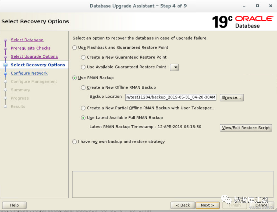 在选择选项之后,下个屏幕会显示一些 Recovery 选项,比如在哪里创建 Guaranteed Restore Point,或者做一个 RMAN 备份或者已经在 DBUA 外创建了备份,那么"I have my own backup and restore stratege "选项可以被选中。