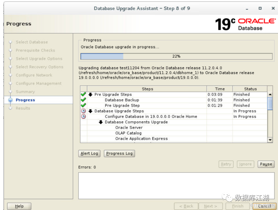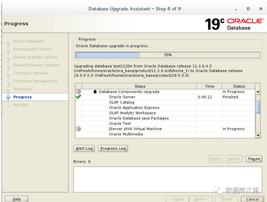 当解决了所有预升级推荐/错误/警告后开始升级,DBUA 会显示升级源库各个组件的进展。