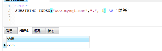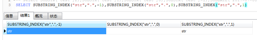5、substring_index(str,delim,count),str是要截取的字符串,delim是截取的字段count是从哪里开始截取(为0则是左边第0个开始,1位左边开始第一个选取左边的,-1从右边第一个开始选取右边的