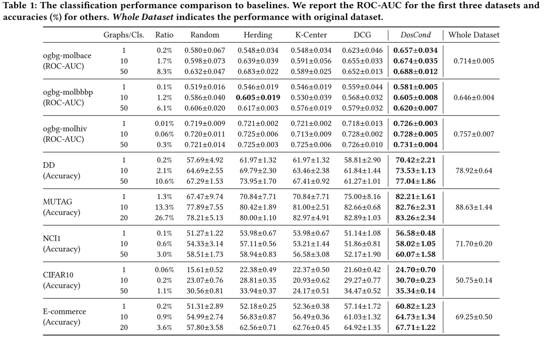 为了验证所提出框架的有效性,本文测量了在压缩图上训练的 GCN 的分类性能。具体来说,本文在 {1, 10, 50} 范围内(对于 MUTAG 和电子商务为 {1, 10, 20})改变每个类别的学习合成图的数量,并在这些图上训练 GCN。然后本文在原始测试图上评估训练好的 GCN 的分类性能。按照 OGB 中的约定,本文报告了 ogbg-molbace、ogbg-molbbbp 和 ogbg-molhiv 的 ROC-AUC 度量;对于其他数据集,本文报告分类准确度 (%)。结果总结在表1中。