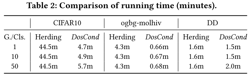 由于本文的目标之一是实现可扩展的数据集压缩,因此本文现在评估 DosCond 的效率。本文将 DosCond 与 coreset 方法 Herding 进行比较,因为它比 DCG 耗时更少,并且通常比其他基线实现更好的性能。本文采用与表 1 中相同的设置:DosCond 的 1000 次迭代,即 1 = 1000,以及 500 个 epoch(ogbg-molhiv 为 100 个 epoch)用于按照 Herding 的要求预训练图卷积网络。本文还注意到,预训练神经网络需要在每个 epoch 遍历整个数据集,而 DosCond 只处理一批图。在表 2 中,本文报告了 CIFAR10、ogbg-molhiv 和 DD 在 NVIDIA V100 GPU 上的运行时间。