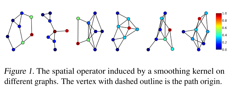 本文提出了 pathGCN——一种克服上述限制的新方法,基于图顶点上定义的随机路径的聚合。使用这种方法可以定义类似于图像二维卷积中使用的空间算子。这样的算子具有可变的孔径和系数,可以增加 GCN 的表现力。此外,由于算子的系数是学习的,它的特征值可能与图拉普拉斯算子的特征值有很大不同。这意味着学习的内核可以扮演不同的角色,从平滑到边缘检测(或锐化)算子。下图给出了由平滑空间核 [0.8, 1.0, 0.6] 诱导的有效空间算子的示例,其中可以看到空间算子同时依赖于图拓扑和空间核。