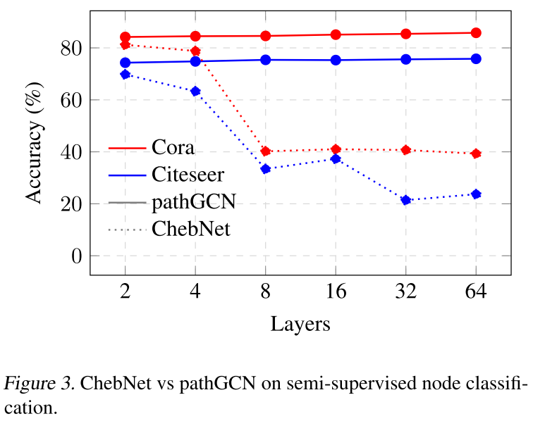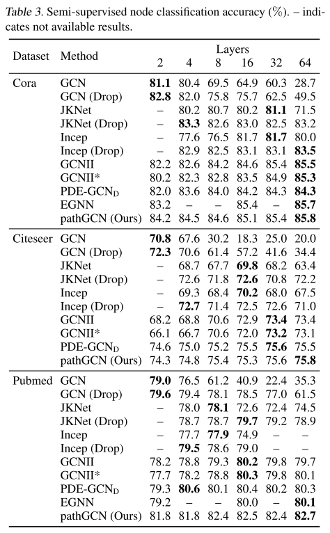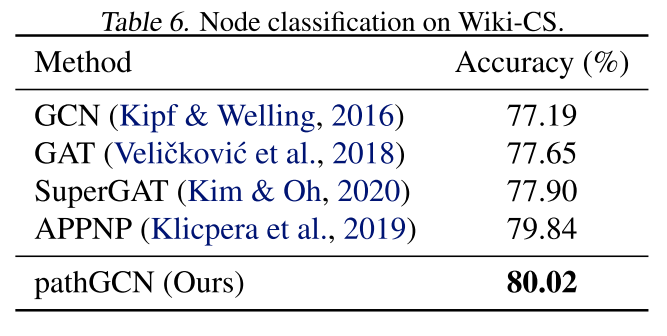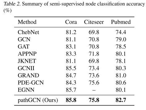 如下表所示,本文的 pathGCN 能够在所有三个数据集上获得更高的准确度。
