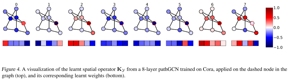 与之前最先进的 GRANDnl-rw 的 81.0% 相比,在 Pubmed 上获得了大胆的改进,准确率达到了 82.7%。本文的方法还受益于过度平滑的固有缺失,因为空间算子已完全学习。这也通过检查网络不同层的学习内核来验证。实际上,如下图所示,一些层通过平均来执行平滑,而另一些层则通过考虑沿路径的相邻节点的差异来充当边缘检测滤波器。
