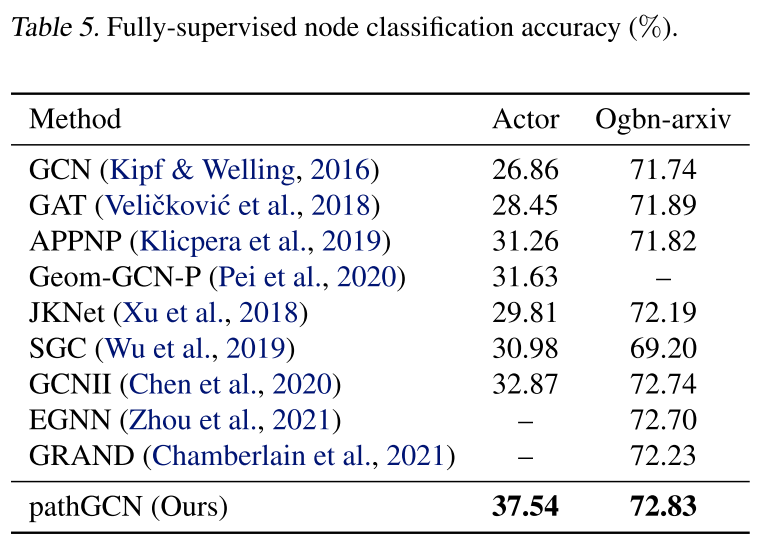 与所有考虑的方法相比,本文的实验获得了所有数据集的改进。例如,使用 pathGCN 在 Cora 上获得了 90.02% 的准确率,而 GCNII* 和 PDE-GCN 的准确率分别为 88.49% 和 88.60%。此外,使用 Actor (Pei et al., 2020)、Ogbnarxiv (Hu et al., 2020) 和 Wiki-CS (20 random splits) (Mernyei) 的标准训练/验证/测试拆分在更大的数据集上检查 pathGCN。在下表中可以再次看到所有考虑过的数据集的准确性提高。