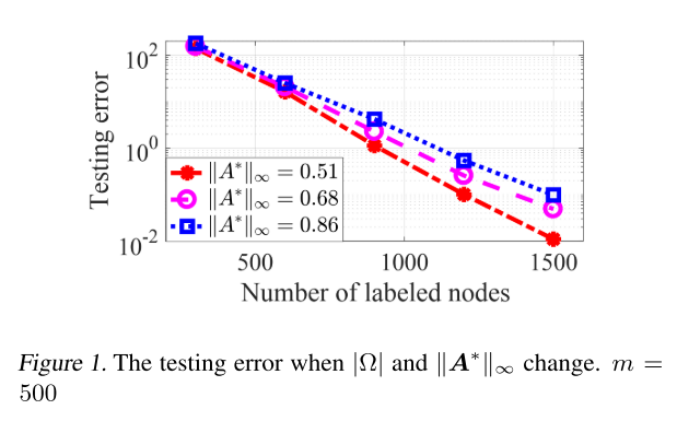 下图显示了测试误差随着标记节点的数量|Ω|增加而减小,当每层 m 的神经元数量固定为 500 时。此外,随着 的增加,所需的标记节点数增加以达到相同水平的测试误差。