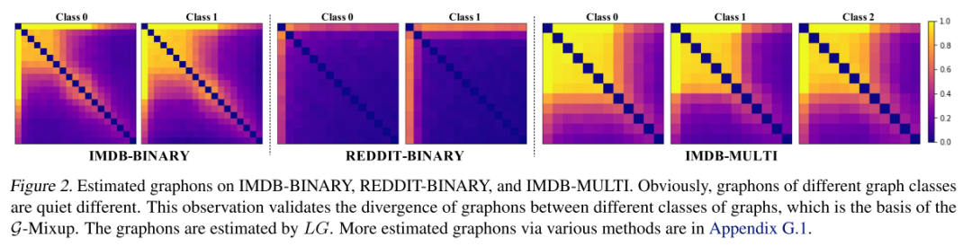 本文可视化估计的图形如下图。结果表明:在一个数据集中,不同类图的图具有明显的差异。下图中IMDB-Binaery的图显示,类1的图有更大的稠密面积,这表明该类中的图比类0的图有更大的范围。图2中的Reddit-Binary图显示,类0的图有一个高度节点,而类1的图有两个高度节点。这一观察结果验证了现实世界中不同类别的图具有明显不同的图,为通过混合图生成混合图奠定了坚实的基础。