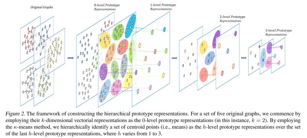本文提出了一个框架来计算一系列 层次原型表示,它封装了一组图 中所有矢量顶点表示的主要特征。计算层次原型表示的框架实例如下图所示。