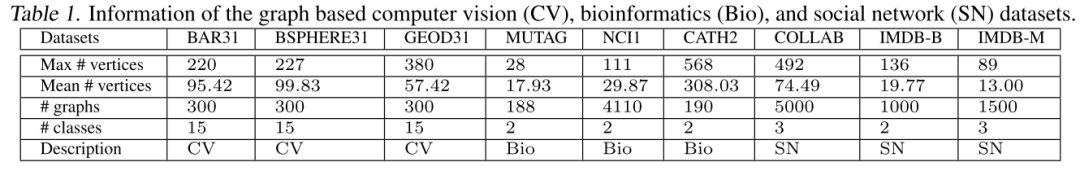 本文在来自计算机视觉、生物信息学和社交网络的九个基准图数据集上评估提出的 HTAK 内核。这些数据集包括:BAR31、BSPHERE31、GEOD31、MUTAG、NCI1、CATH2、COLLAB、IMDB-B 和 IMDB-M。这里的 BAR31、BSPHERE31 和 GEOD31 数据集都是从 SHREC 3D Shape 数据库中抽象出来的,该数据库由 15 个类和每个类 20 个个体组成。具体来说,本文通过三个映射函数建立 BAR31、BSPHERE31 和 GEOD31 数据集,即 a) ERG 质心:距质心/重心的距离,b) ERG bsphere:到外接物体的球体中心距离,c) ERG 积分测地线:到所有其他点的测地线距离平均值。其他数据集都可以在网站 http://graphkernels.cs.tu-dortmund 上找到。这些数据集的更多细节如下表所示:
