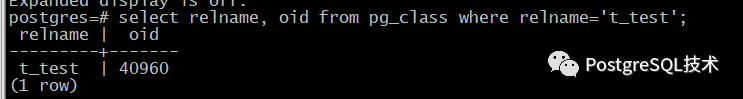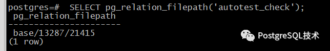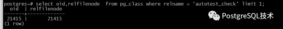 比如查看postgres数据库下的autotest_check表的oid和relfilenode
