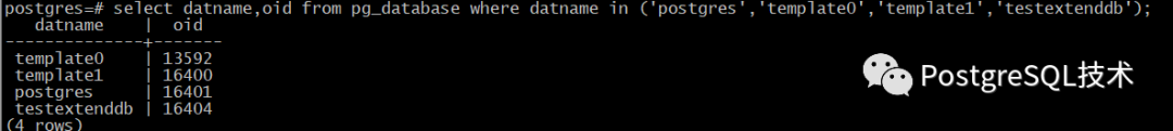 select datname,oid from pg_database where datname in ('postgres','template0','template1','testextenddb');