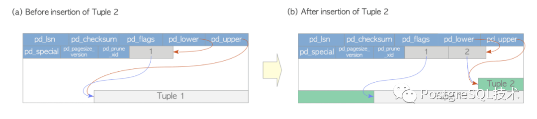 插入第二个元组时,它被放置在第一个元组之后。第二行指针被压入第一行,它指向第二个元组。pd_lower指向第二行指针,而pd_upper指向第二个堆元组。见图1.5 (b)。这个页面中的其他头数据(例如,pd_lsn, pg_checksum, pg_flag)也被重写为合适的值; 更多详情见第5章和第9章。