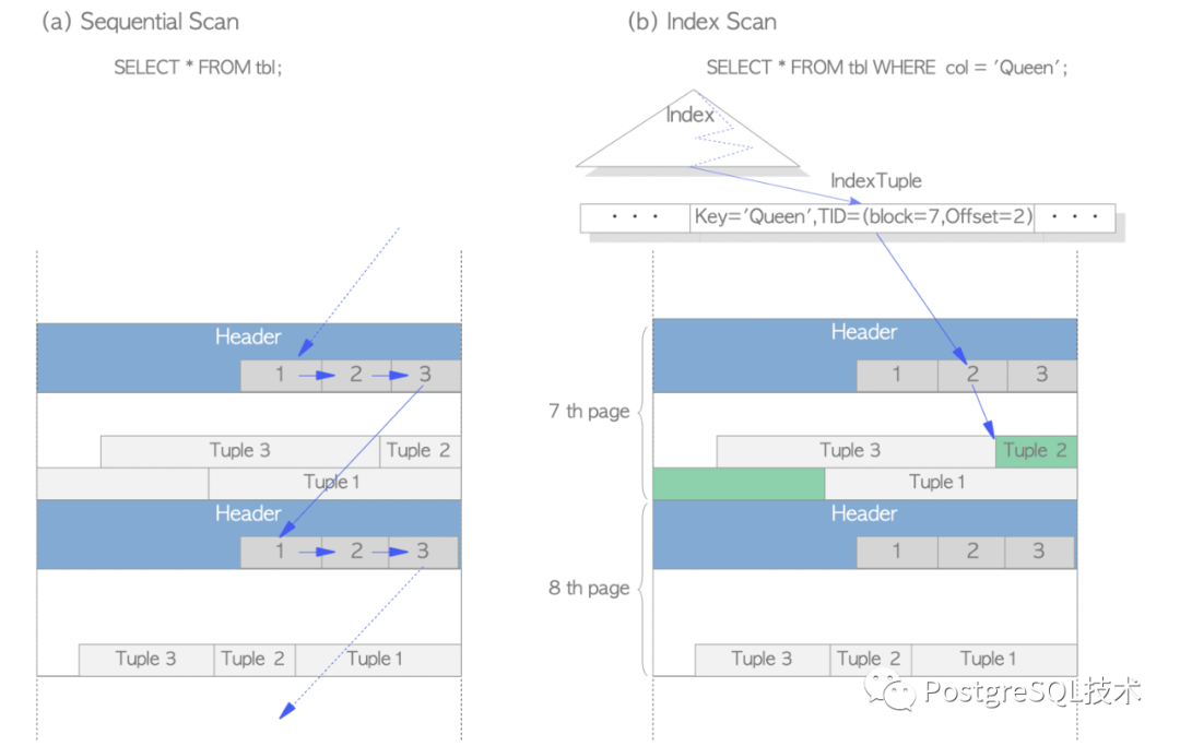 B-tree索引扫描——索引文件包含索引元组,每个索引元组由一个索引键和一个指向目标堆元组的TID组成。如果您正在寻找的键的索引元组已经找到,PostgreSQL将使用获得的TID值读取所需的堆元组。例如在图1.5(b)中,得到的索引元组的TID值为' (block = 7, Offset = 2) '。这意味着目标堆元组是表中第7页的第2个元组,因此PostgreSQL可以读取所需的堆元组,而无需在页面中进行不必要的扫描。