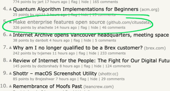 图 1:你们中的许多人和我们一样对开源 Citus Enterprise 的剩余功能感到兴奋。我在 GitHub 上对这些企业功能进行开源的提交是我唯一一次出现在Hacker News 头版的提交。