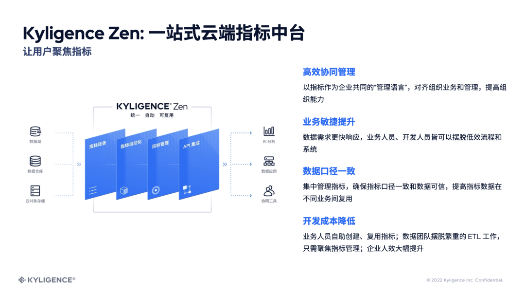 云原生时代,企业的数字化转型正不断深入,新的技术架构、新的业务方向、新的管理模式都将深刻改变整个行业。一站式云端指标中台 Kyligence Zen 将助力更多企业构建更可靠的指标体系,赋能业务人员以指标驱动业务决策,释放业务自助分析潜力。