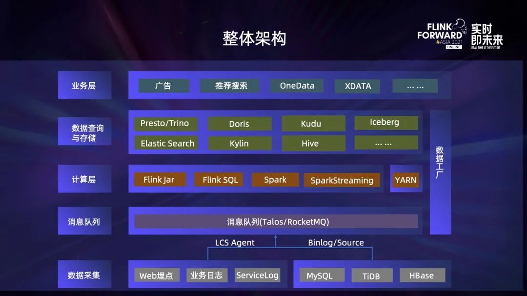 数据采集层主要负责收集各类数据,数据的来源分为两类,一类是埋点和业务日志以及服务日志,经由 LCS Agent 进行采集,另一类是数据库数据经由 Binlog 或 Checkpoint 数据集成等方式收集到消息队列中。以 Flink、Spark 为主的计算层对其进行处理,并最终存储到各类存储和查询服务中,供业务使用。Flink 是计算层实时和准实时处理的主要框架,在其中正发挥着越来越重要的作用,尤其是 Flink+Iceberg 数据湖技术,正在让流批一体成为现实。