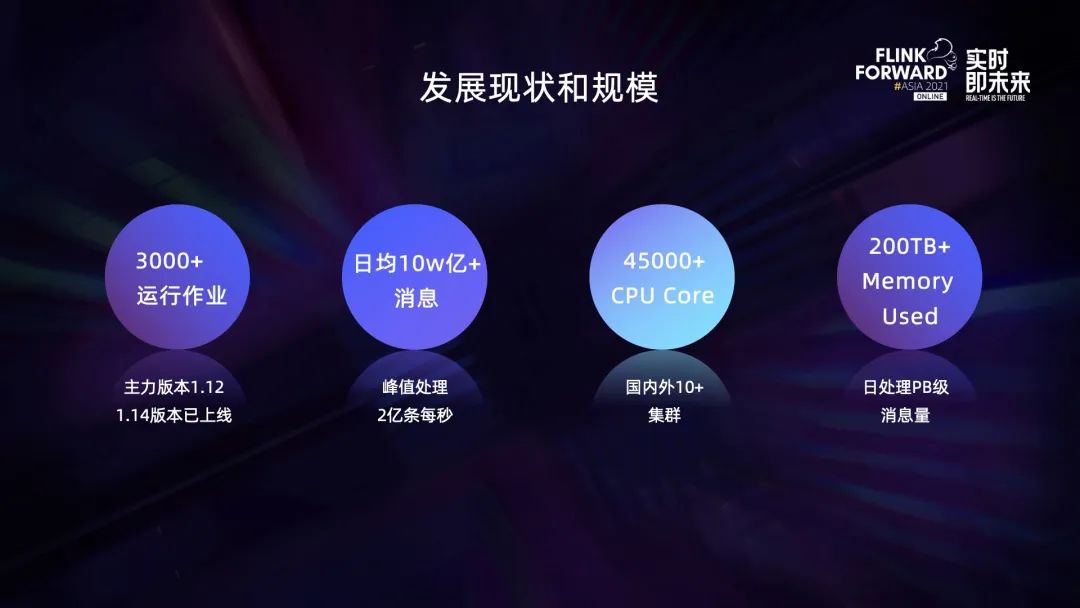 目前我们的集群上运行着 3000 多个作业,主力版本是 1.12,1.14 版本也已经合并上线,日均处理 10 万亿+ 条消息,PB 级的数据量,峰值数据 2 亿条/秒,运行在国内外 10 多个集群,使用超过 45000 个 CPU core,内存使用超过 200tb。