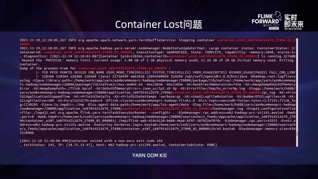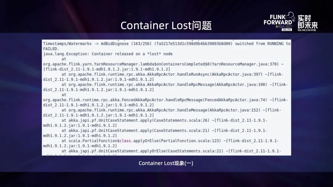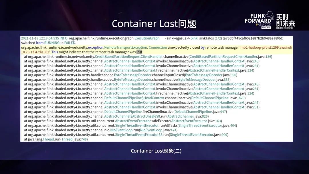 上图是 container lost 现象的提示之一,一般老版本的 Flink 中出现比较多。