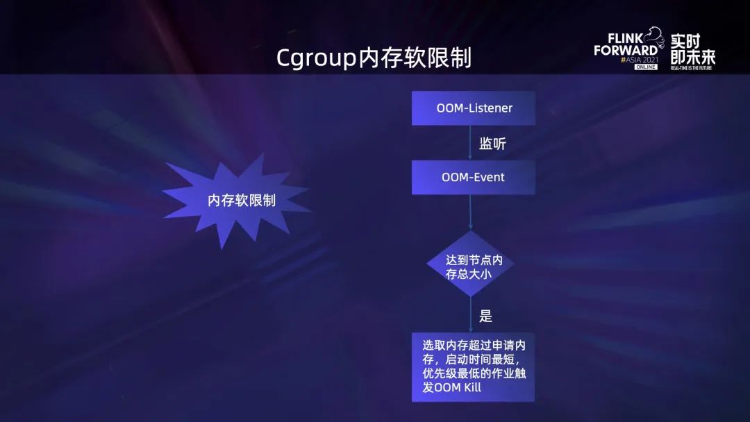 Cgroup 的方式主要是开启内存软限制,它对 container 的内存限制不再是基于单个 container 的内存申请量,而是整个 Nodemanager 的内存量。这个时候如果 NodeManager 上仍有富余内存,内存超用的 container 就可以接着使用这些富余的内存。一个节点上同时存在多个 Container 内存超用导致整个节点内存达到上限,才会触发 oom event。Oom listener 对该事件进行监听并判断,如果达到节点总内存就会选取内存实际占用量超过申请量且启动时间最短、优先级最低的作业触发 oom kill。