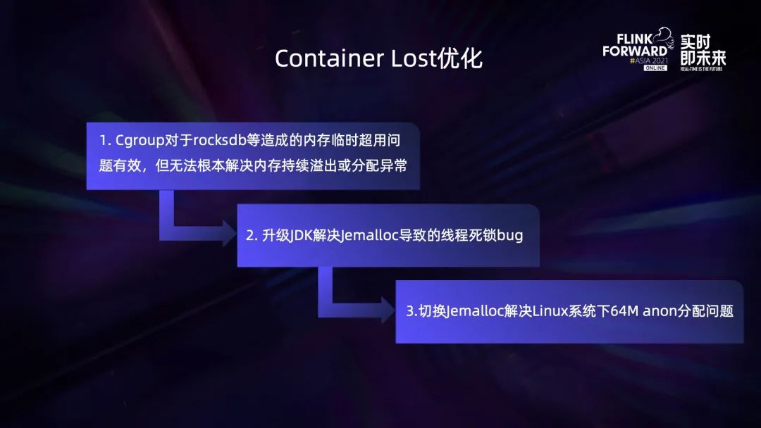 使用 Cgroup 解决内存临时超用的问题,比如 RocksDB 对内存的限制不严格、小白用户对内存的设置和使用不正确等造成的问题,然后升级 JDK 版本,解决 Jemalloc 分配时的线程死锁 bug,最后切换 Jemalloc,解决 Linux 系统下的 64M anon 分配 bug。