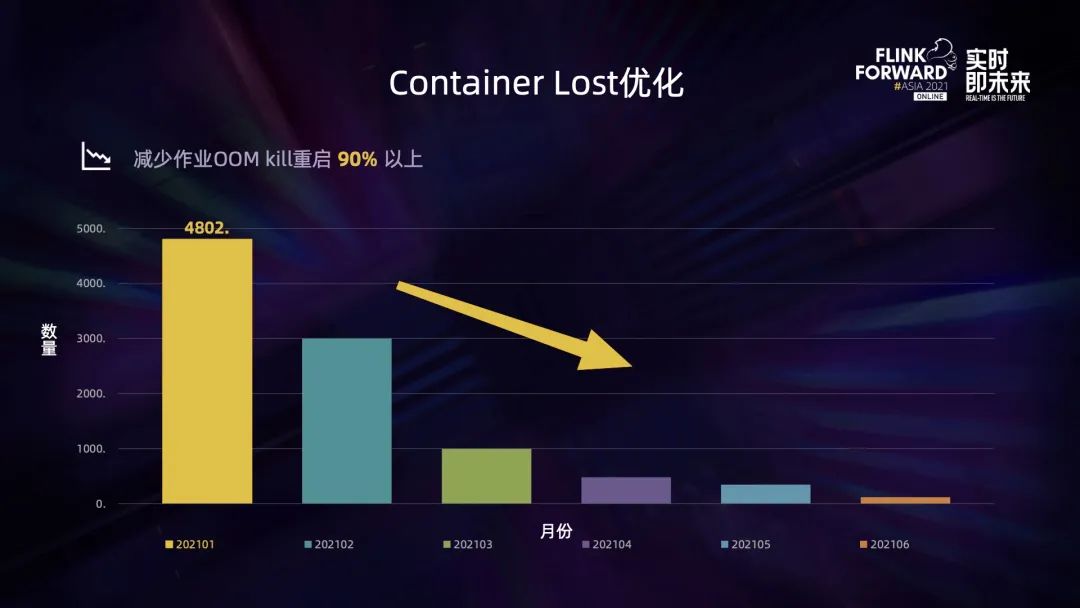 经过一系列的优化,从上图可以看出,container lost 的频率由每月的近 5000 次减少到不到 100 次,因 Yarn oom kill 造成的作业异常重启减少了 90% 以上,效果显著。