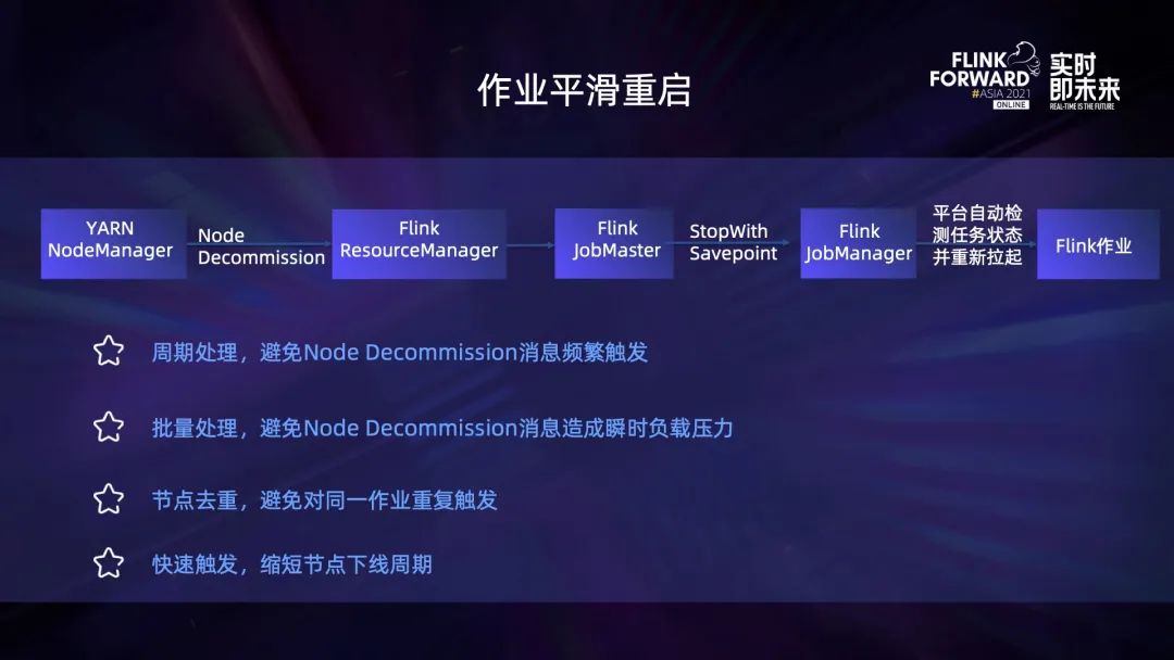 第二个优化实践是节点的平滑重启功能,流式作业是长时间运行的作业,由于大部分都运行在廉价的机器上,因此机器出现过保、硬件故障、维修下线、机房迁移等都比较常见。为了提前预防可能出现的隐患,避免框架重启造成的影响,提升云环境下作业的稳定性,解决 Yarn 模式下恢复时间过长带来的问题,我们开发了作业的平滑重启功能。