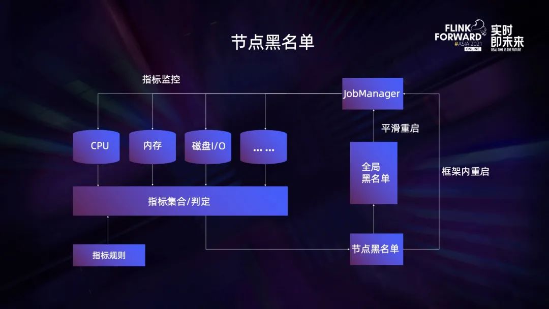 JobManager 会启动指标收集监控线程,并周期性地采集节点的 CPU、内存、磁盘 io 和网络 io 等指标,然后汇聚成指标集合,通过动态指标规则对指标进行判定,如果满足条件就会将其加入到节点黑名单,这样该 Application 的 container 便不会再运行在这个节点上。如果某个节点被多个 application 加入黑名单,则表明该节点可能存在问题,会自动触发作业平滑重启,并进行监控报警,以此来自动发现可能的异常节点。