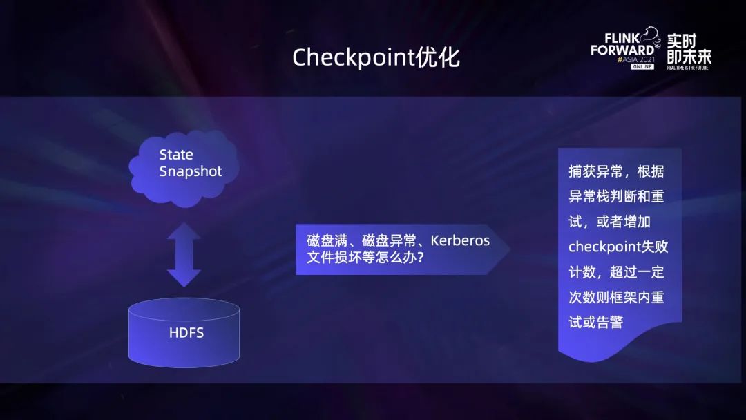 针对磁盘满、io 异常、Kerberos 文件损坏的问题,我们会捕获异常栈,根据异常栈进行判断和重试,并在失败时增加 Checkpoint 的失败计数,超过一定次数则进行框架内的重启,或向用户发送告警,保证作业不会出现长时间的 Checkpoint 失败而从一个非常老的 Checkpoint 恢复。