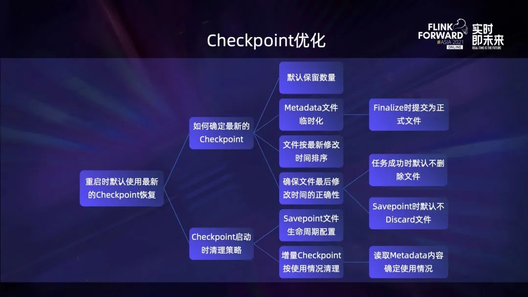 针对作业重启时无法从 Checkpoint 恢复的问题,优化方式是对每个作业设置默认的保留数量,并在进行 Checkpoint 时先生成一个临时的 Checkpoint Metadata 文件,只有在 Finalize 时才会被 rename 成正式的文件。接着将所有 Checkpoint 文件按最后修改时间降序排序,在其中寻找正式的 Checkpoint Metadata 文件。如果成功则表明其是一个完备的、可用于恢复的 Checkpoint 文件。