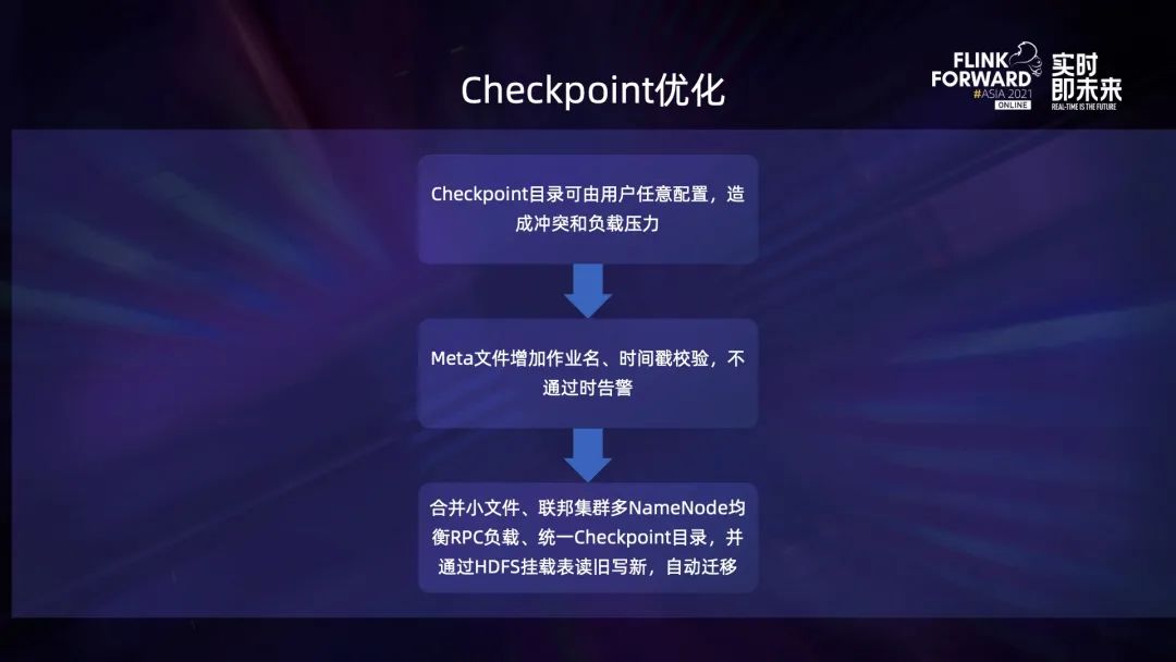 此外通过联邦集群的方式,使用多个 Namenode 均衡 RPC 请求负载,每一个 Namenode 都是一个相对独立的服务,然后对用户作业规范其 Checkpoint 目录,使其访问能够被均衡到多个 Namenode 上,再对旧的 HDFS 文件通过挂载表的形式读旧写新,逐步实现自动迁移到新的统一的规范目录下。