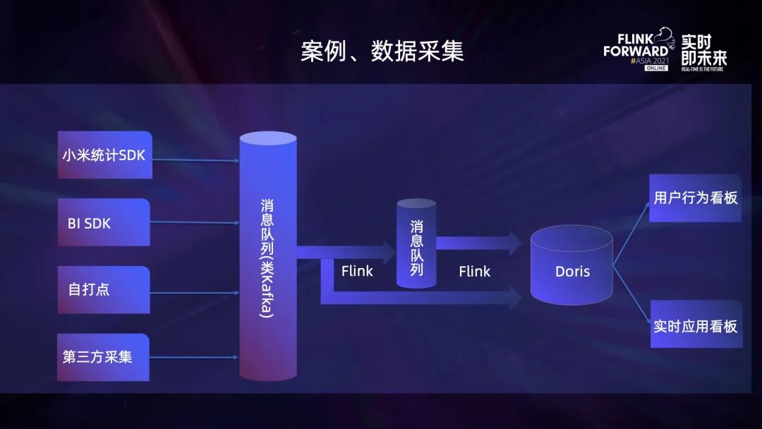 接下来介绍一个案例,该案例来自小米数据采集服务,图示是他们非常简单的架构图,主要是将多个源端 SDK 的埋点和数据收集到消息队列中,然后使用 Flink 进行 ETL,最终存储到 Doris 中并在看板上进行展示。