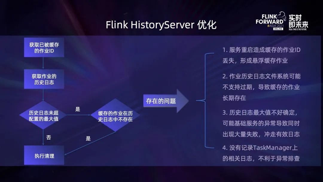Flink Historyserver 会在每一次定时清理时获取上一次清理已经被缓存的作业 ID,再获取本次已经打包的历史日志信息,然后判断历史日志是否已经超过了配置的最大值,若是,就会将后面的历史日志直接执行清理,否则就会判断上一次缓存的作业在当次历史日志中是否存在,如果不存在也会执行清理。