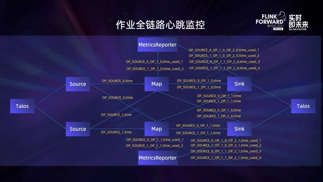 作业的全链路心跳监控功能主要是对作业的链路延时进行监控,实现方式是通过在 Stream Checkpoint 中插入特殊标记,标记信息包括作业的名称、当前的时间,名称的生成方式是 op+operator 在整个链路的 index 以及 subtask 在 operator 的 index,非 Checkpoint 节点会在收到标记后更新名称,并用当前的时间减去 Checkpoint 插入的时间生成从 Checkpoint 到该 subtask 的耗时,并上报到 Metrics Reporter 中,最终对这些 metrics 进行计算,通过这种方式可以发现链路中的异常节点,监测作业的数据异常丢失,还能够通过心跳信息的插入频率预估其影响。
