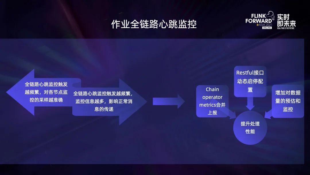 一是将 chain operator metrics 信息进行合并上报,因为它的监控信息基本相同,这样可以减少上报的数据量。 二是通过 restful 接口动态启停监控,这样只有在有异常时才会进行采样和监控,正常情况下不影响作业的运行。 三是通过对采样进行周期性的合并和处理,实现了对任务 pipeline 数据量和延迟的预估以及监控功能。