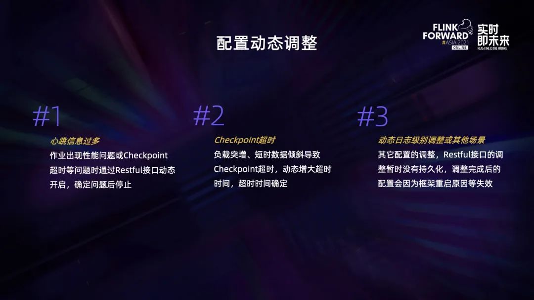 当作业出现性能或 Checkpoint 问题时,可以通过 restful 接口动态开启、问题确定后动态停止,这样就能解决心跳信息过多的问题。在负载突增、短时数据倾斜导致 Checkpoint 超时,动态调整 Checkpoint 超时时间能避免作业因 Checkpoint 超时而失败,它也能避免由于 Checkpoint 长时间不成功导致数据积压更多、数据倾斜问题更严重而陷入的死循环。同时它还能用于确定超时时间,用户可以通过动态调整的方式,不断测试最适合作业的超时时间,减少了压测过程中的作业启停次数。它也支持其他配置的调整,比如动态调整日志级别,但是需要注意的是调整后的配置并没有持久化,会因为框架重启或作业的重启而失效。