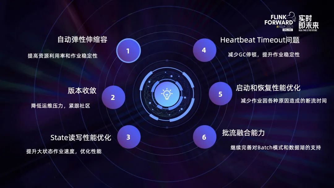 持续开发并优化自动弹性伸缩容的功能。Flink1.13 开始提供了自动弹性伸缩容的功能,但是目前并不完善,要在生产环境上用起来还需要做不少的工作。 版本收敛是很多Flink开发人员都会遇到的一个问题。Flink 社区的发展比较快,版本的发布和迭代也是非常快。为了降低运维压力,紧跟社区,这也是势在必行的。 对 state 读写性能进行优化,提升大状态作业的性能。 Heartbeat timeout 也是目前线上对稳定性影响比较大的问题,我们也会进行跟进和优化。 对作业启动和恢复性能进行优化,减少作业因各种原因造成的断流是 Flink 社区和许多业务非常关注的问题,我们同样也有面临着这样的压力。 继续打磨批流融合能力,完善对 batch 模式和数据湖等的支持,也是现在的热点,我们希望能在这上面进行更多探索,从而更好地支撑业务,也让 Flink 的应用更加广泛。