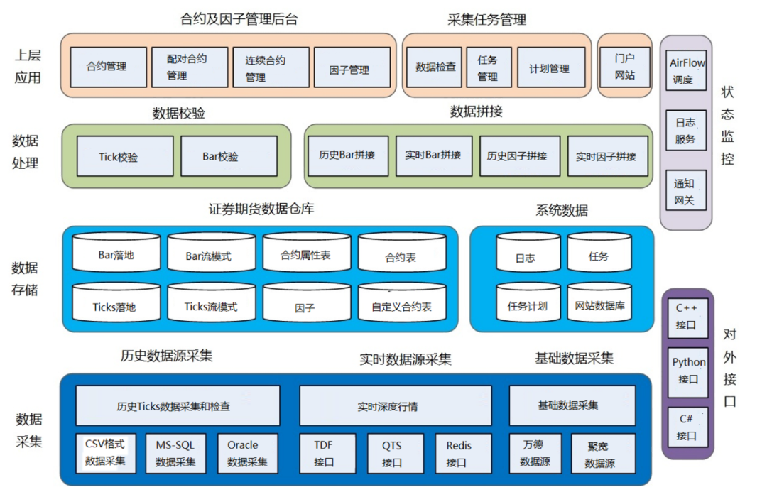 数据采集:支持 CSV 文件,系统可以采集 SQL、Orcale、万德、国泰安、通联、聚宽等数据源的历史行情、实时行情及基础数据。 数据存储:使用 DolphinDB 存储包括流模式和库模式的 Ticks 和 Bar、合约信息、基类、因子及自定义合约。PostgresSQL 存储数据中心的日志、任务、自动或手动计划及门户前端数据库信息。 数据处理:Builder 实现历史及实时 Ticks 拼接 MinBar 和 HourBar,连续合约和配对合约。Validator 校检日线数据和 Tick 数据的准确性。 上层应用:主要分管理后台和采集任务管理。管理后台提供合约管理功能,包括查询、自定义合约、连续合约和因子等。采集任务管理包括自动或手动采集管理数据,计划任务管理及数据完整性检查。 状态应用:提供 AirFlow 调度平台的运行状态、日志服务及通知网关。 对外接口:支持 Python,C++,C#等 API 接口。