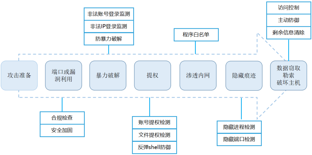 RS-CDPS 融合 ATT&CK 理念,分析黑客攻击的关键节点,从黑客攻击流程关键节点建立威胁事件的检测、监测、响应联动机制,从弱口令检测、风险检测加固、入侵监测响应、攻击主动防御等维度,对黑客攻击的关键节点进行全方位综合防护,提升主机抗攻击性和主动防御能力。